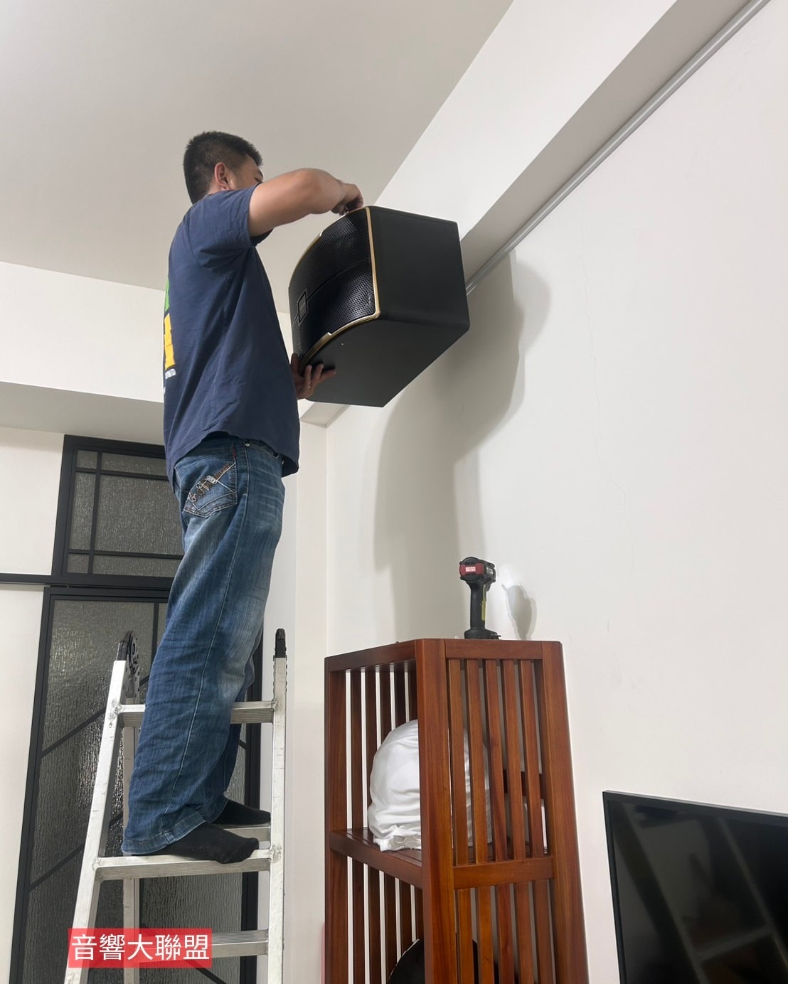 因為距離的關係,業主在網路與我們做充分溝通後就安排進場,以客廳現況來看,主喇叭選擇懸吊式的比落地適合。但因天花板算是有挑高,現場評估後決定改壁掛方式,視覺感覺又更清爽俐落些。