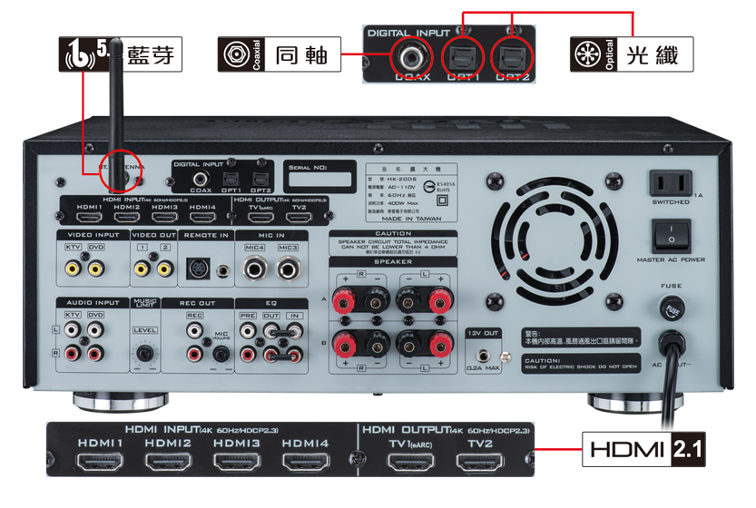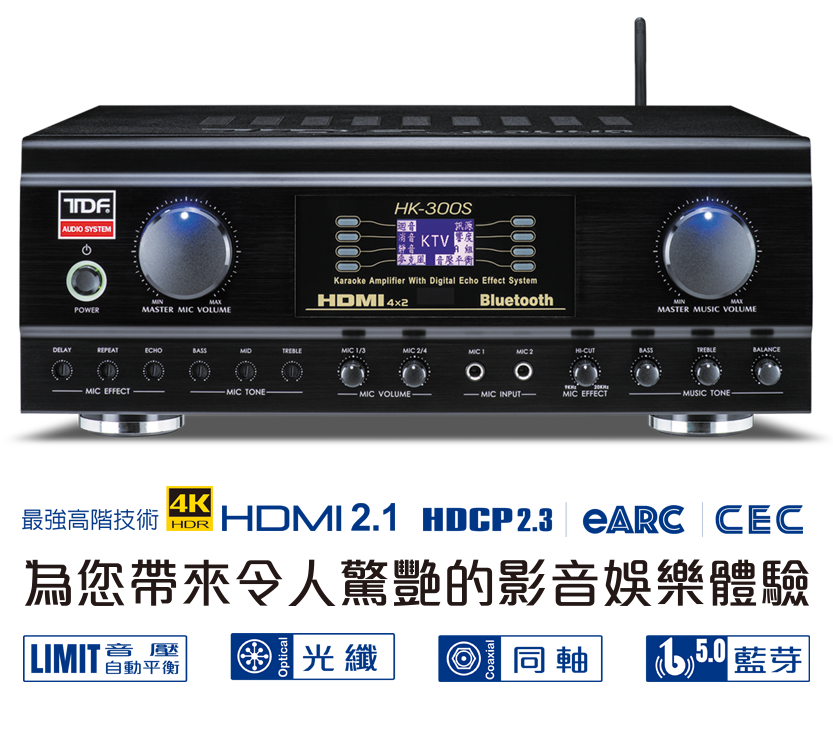 - 具有11組立體聲訊號輸入功能: K T V、D V D、H D - 1、H D - 2、H D - 3、 H D - 4、 e A R C、C O A X、O P T 1、O P T 2、藍芽。